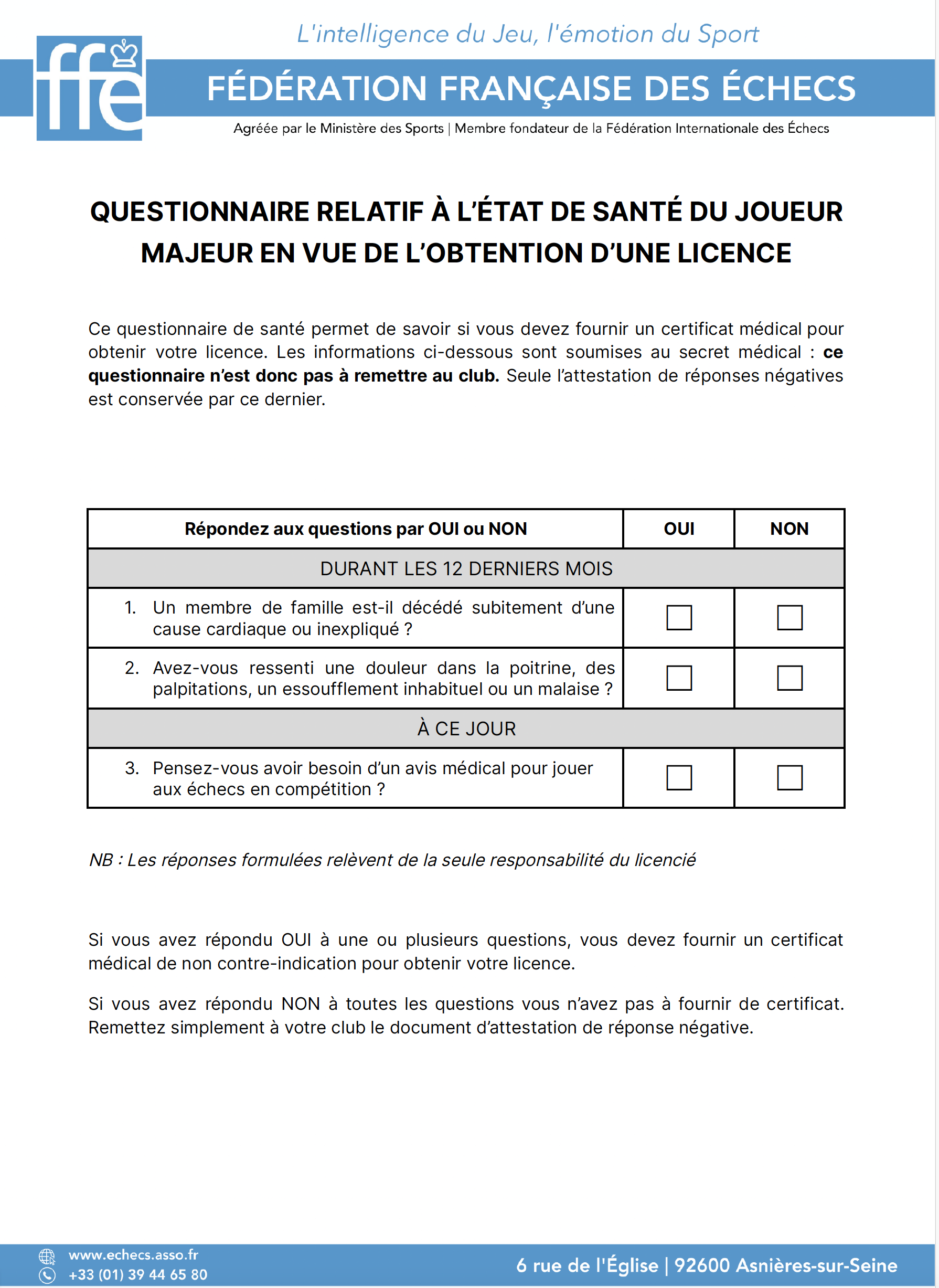 Comme tous clubs sportifs, les clubs d'Échecs se doivent de vérifier que l'état de santé de leurs adhérents sont compatibles avec la pratique de l'activité. La procédure est la suivante : un questionnaire médical est porté à votre connaissance lors de l'adhésion (un modèle pour les majeurs et un modèle pour les mineurs). En vertu de leur caractère confidentiel, les réponses que vous y apporterez ne devront pas être communiquées au club. En revanche le club vous demandera de signer un document attestant que vous avez pu répondre négativement à toutes les questions posées. Si cela n'était pas le cas, un certificat médical pour la pratique du Jeu d'Échecs serait exigé pour l'inscription.